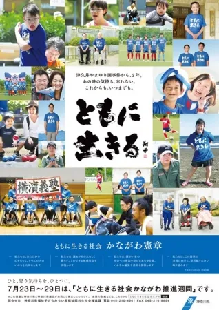 神奈川県は、平成28年7月26日に発生した津久井やまゆり園での痛ましい事件を忘れないため、さらにはともに生きる社会について多くの人々に考えてもらう契機を提供することを目的とした「ともに生きる社会かながわ推進週間」を開催しています。この推進週間は平成30年7月23日(月)から29日(日)までの期間に実施され、様々な広報活動が展開されます。