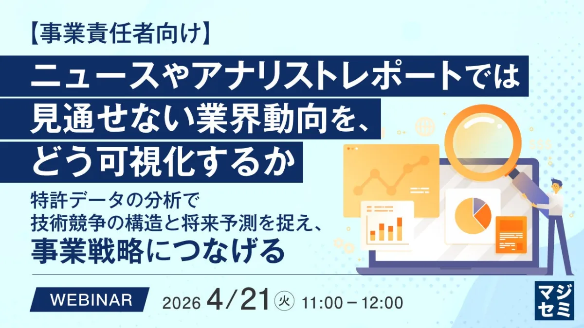 また、マジセミでは過去のセミナー資料を公開しており、他の募集中のセミナーもありますので、ぜひこれを機に参加をご検討ください。ウェビナーを通じて得た知識を活かし、貴社の事業に真の価値をもたらすことを願っております。特許データを駆使し、自信をもって未来の市場で勝ち残っていくための第一歩を踏み出すチャンスです。