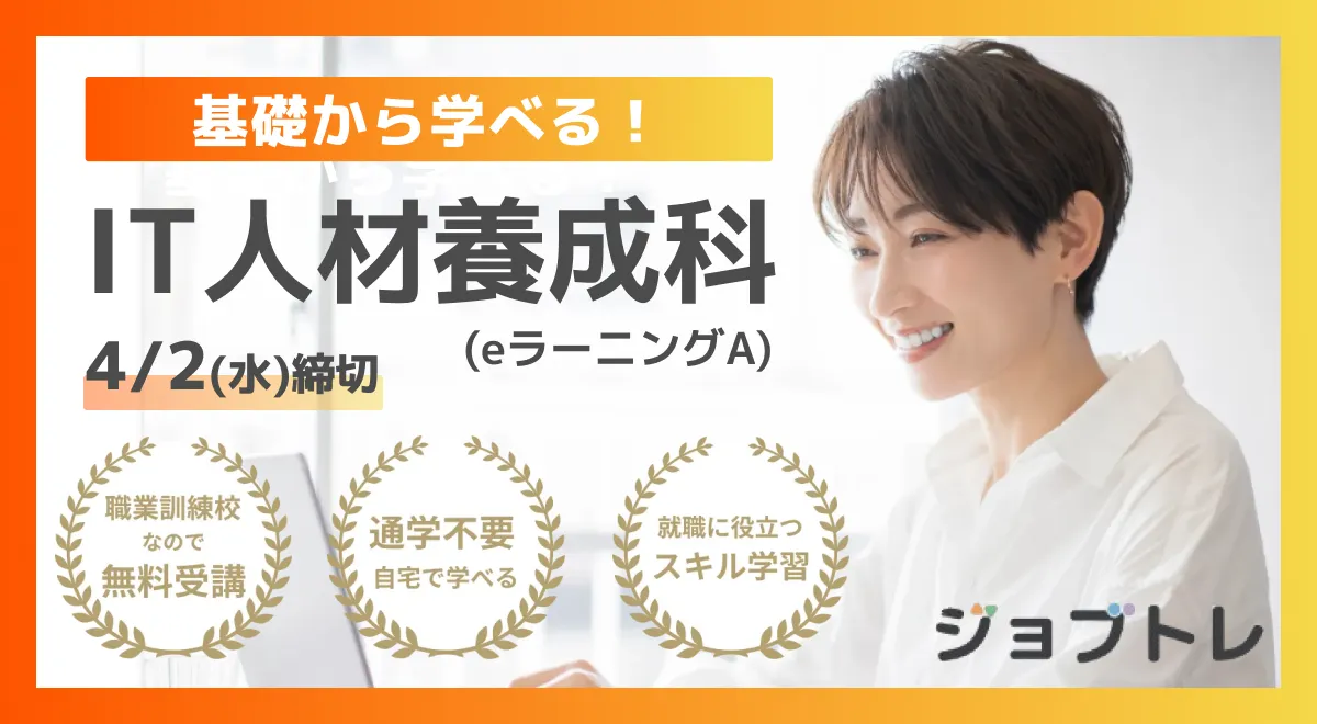 ワークキャリア株式会社が運営する「ジョブトレ」の新しい職業訓練コース、「基礎から学べる!IT人材養成科(eラーニングA)」が4月22日から開講されます。このプログラムは、厚生労働省の認定を受けたeラーニング型の求職者支援訓練で、現在受講生を募集中です。