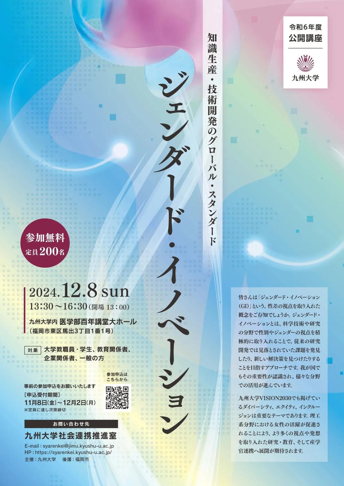 2024年12月8日、九州大学で「ジェンダード・イノベーション」公開講座が開催されます。この講座は、性差の視点を取り入れた新しい科学技術や研究のアプローチを探求するものです。特に、現代の研究開発では見落とされがちな問題の発見や、新たな解決策の提供を目指しています。