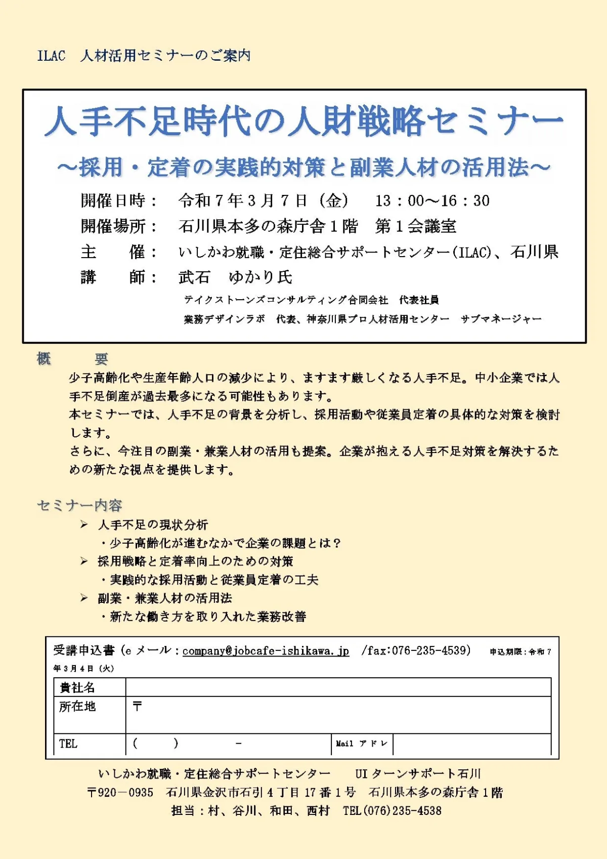 石川県の「いしかわ就職・定住総合サポートセンター」(略称:ILAC)が主催する「人手不足時代の人財戦略セミナー」が、2025年3月7日(金)に開催されます。本イベントは、少子高齢化の進展や生産年齢人口の減少が続く中で、厳しい状況にある人手不足を克服するための具体的な対策を議論する場となります。