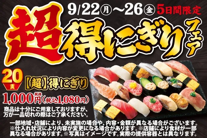 「超得にぎりフェア」は毎回多くのファンに支持されるイベントで、今回もその人気を裏切らない内容となっています。提供されるのは、マグロ、エビ、しめ鯖軍艦、さらにねぎまぐろなどの定番ネタが20貫もセットになったお得な商品です。価格は、なんと税込1,080円!