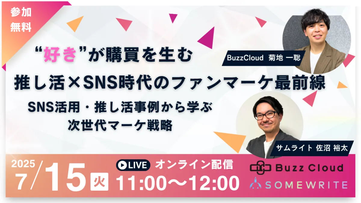 デジタル時代が到来する中、SNSを通じたファンの声が企業の売上に直結するようになりました。特に、個人の熱意や「推し活」が重要な役割を果たしています。そこで、BuzzCloud株式会社とサムライト株式会社が共催するウェビナー「“好き”が購買を生む推し活×SNS時代のファンマーケ最前線」が開催されます。このオンラインセミナーでは、SNSを駆使した次世代マーケティング戦略について学ぶことができます。