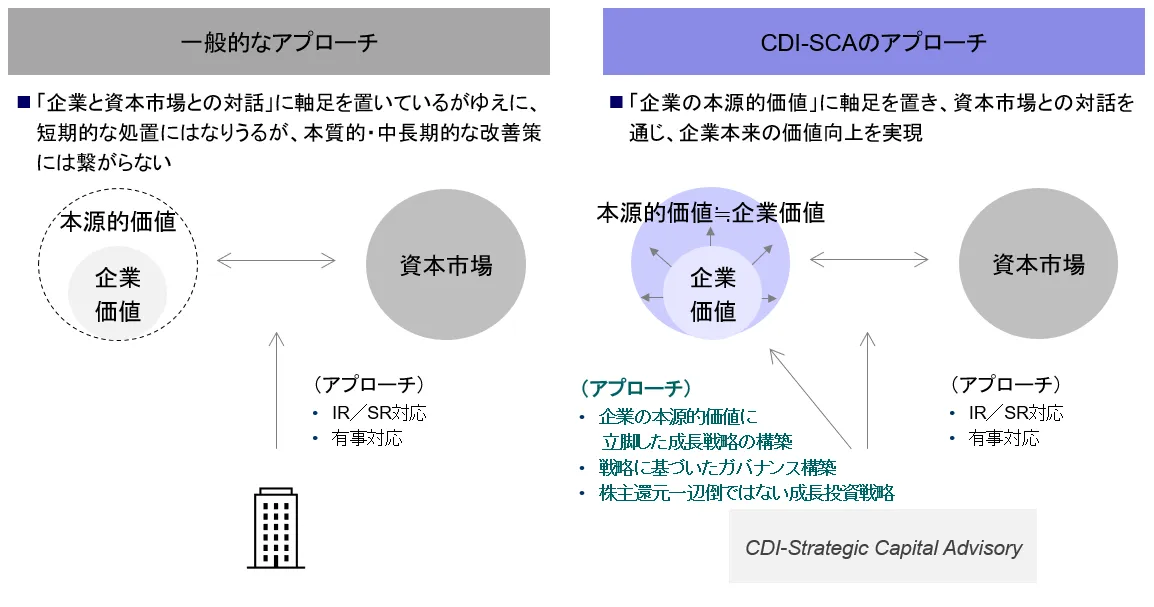 SCAでは、CDIがこれまでの経験を活かし、一過性の対応ではなく、企業の持っている本質的な価値の最大化を目指します。このアプローチにより、企業と資本市場との間での本質的な対話を促進し、中長期的な企業価値の向上を実現いたします。