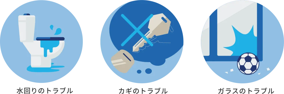 「住まいのアシスタンスサービス」では、主に次の3つのトラブルに対応します。これにより、契約者は安心して日常生活を送ることができます。