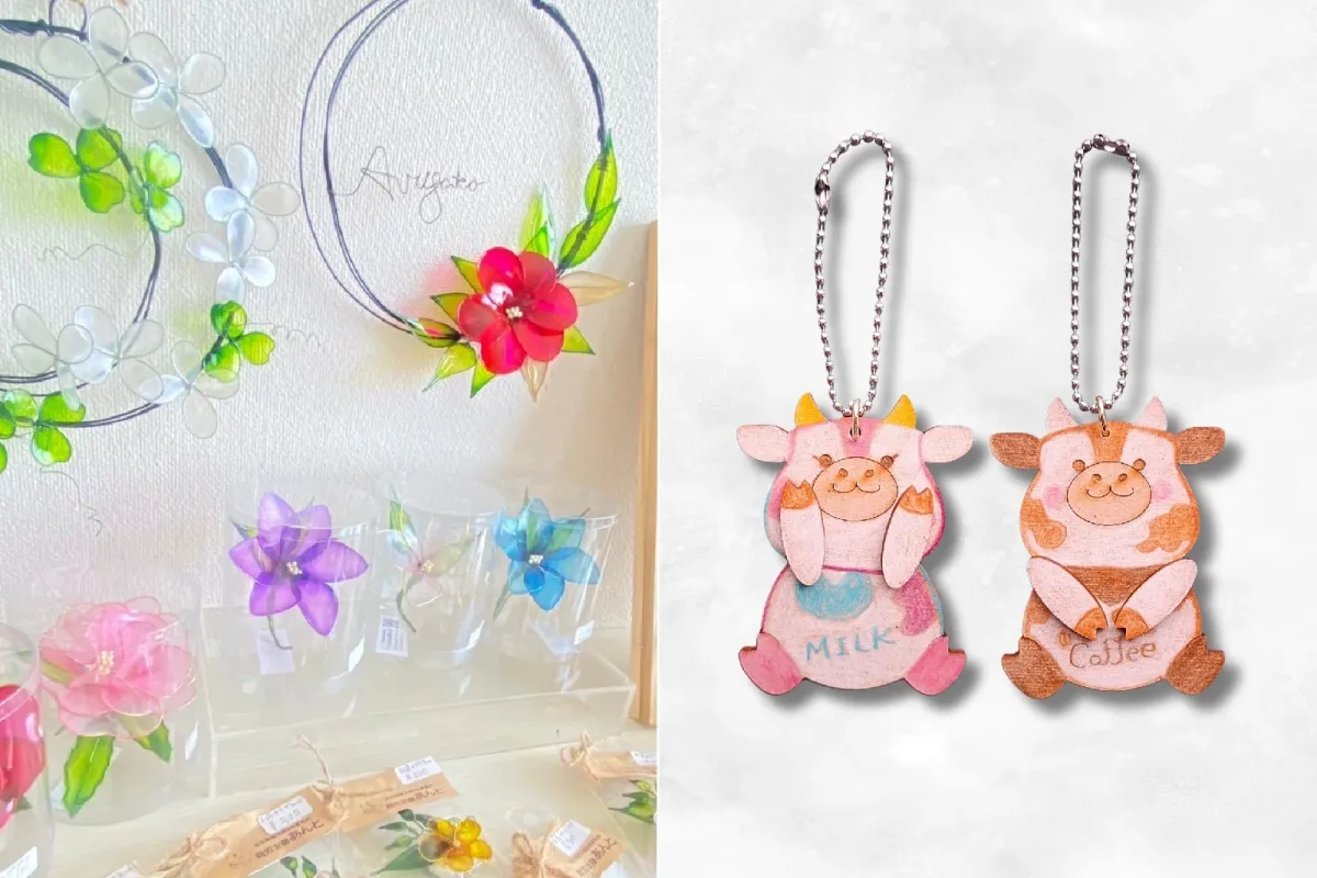 「就労支援あんと」は、ワイヤーや色付けなどの工程を利用者が協働して行い、透明感のあるディップアートを製作・販売します。以下のようなユニークで魅力的なアイテムが揃います。