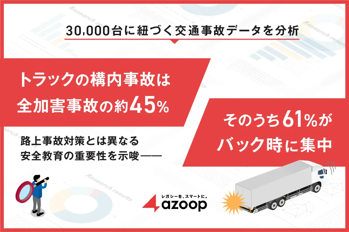 Azoopが提供する運送業向け業務支援サービス『トラッカーズマネージャー』に蓄積された3万台の車両の事故データを基に、トラック構内での交通事故状況を詳細に調査したところ、全加害事故の中で45%がトラック構内事故であることが分かりました。特に驚くべきは、それらの61%がバック時に発生しているという点です。このデータは、従来の一律的な安全教育では不足していることを示しています。