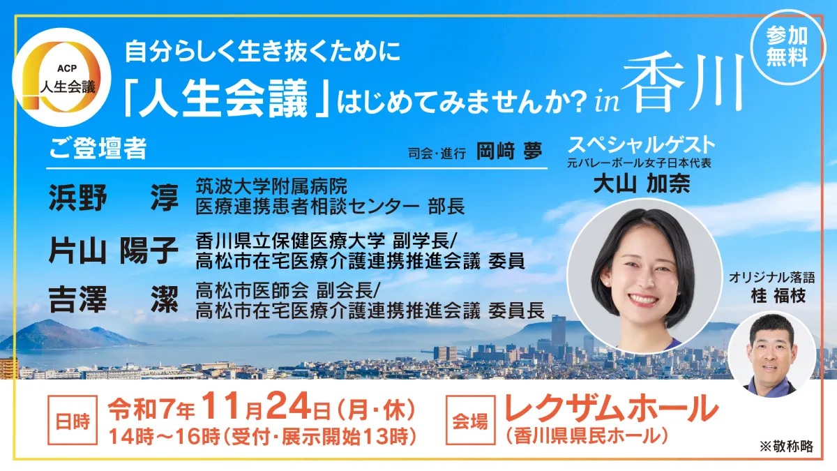 令和7年度の人生会議(ACP:アドバンス・ケア・プランニング)に関する普及啓発イベントが、11月24日(月・休)に香川県高松市にて行われます。厚生労働省が主催し、地域の健康構築に向けた意識を高めるべく、このイベントが設けられました。
