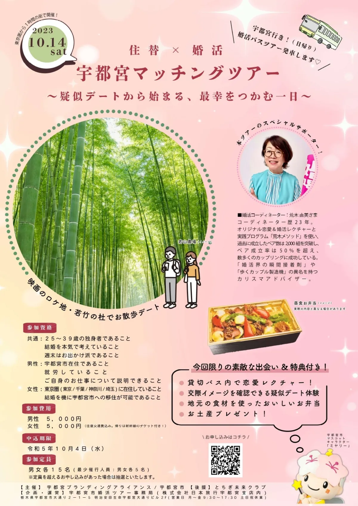 参加資格は、25~39歳の独身者で、結婚を真剣に考えていること、週末はお出かけを楽しむアクティブな方であることなどが挙げられていました。男性は宇都宮市在住者、女性は東京圏(東京都、埼玉県、千葉県、神奈川県)在住で、将来的に宇都宮市での結婚・居住を希望する方が対象とされました。