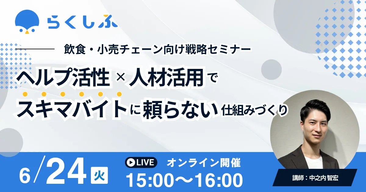 株式会社クロスビットは、2025年6月24日(火)に無料オンラインセミナー「ヘルプ活性×人材活用でスキマバイトに頼らない仕組みづくり」を開催します。新型コロナウイルスの影響や急激な物価上昇、光熱費の高騰が企業に重くのしかかる中、飲食・小売業界では運営コストの見直しが急務となっています。