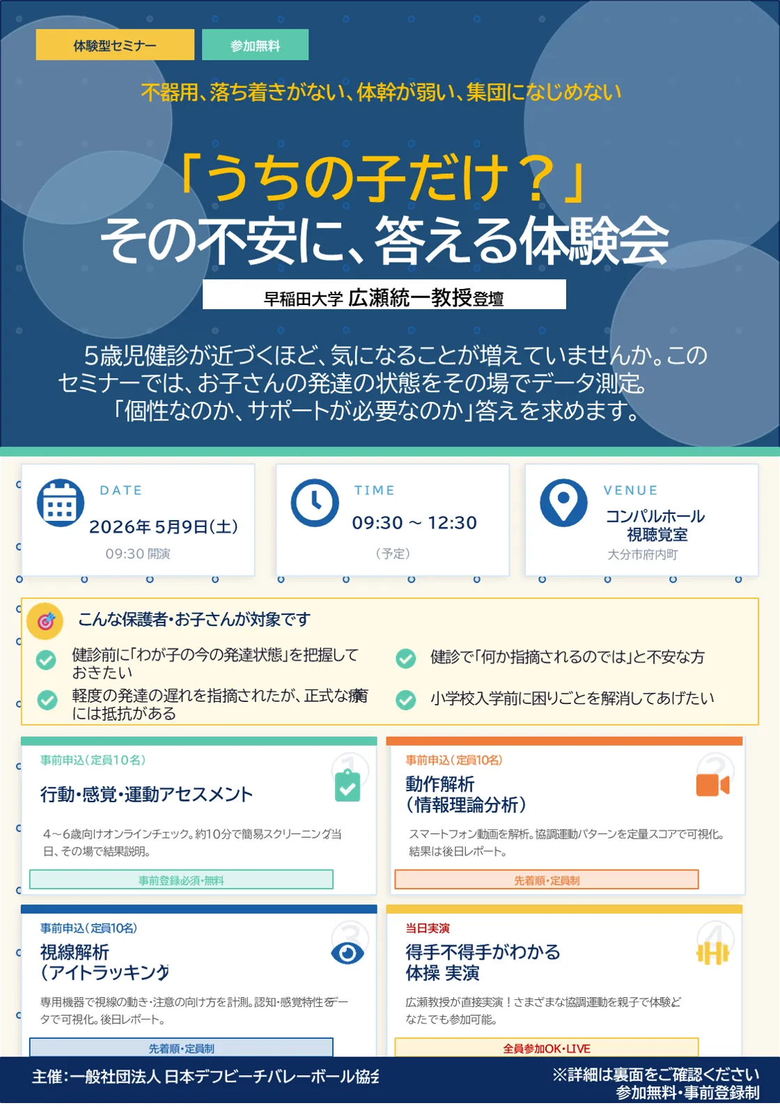 2026年5月9日(土)、大分市のコンパルホール視聴覚室で、発達に不安を抱える保護者を対象にした体験型セミナーが開催されます。このセミナーは、一般社団法人日本デフビーチバレーボール協会主催で、早稲田大学の広瀬統一教授が登壇し、参加費は無料で事前登録が必要です。このイベントでは、特に発達性協調運動障害(DCD)の子どもたちに対する理解を深めるためのプログラムが用意されています。