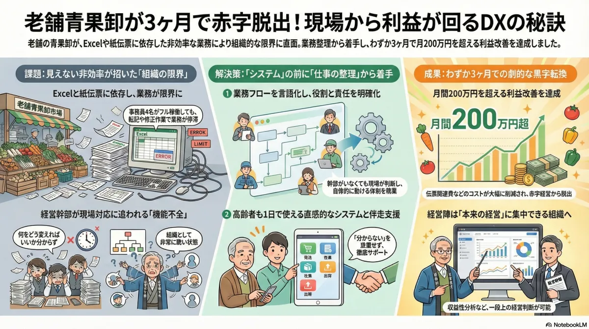 嶋田氏は最後に、「システム導入に頼るのではなく、業務の整理が最も重要です。現場での判断基準を明確にすることが、経営の安定にもつながります」と語りました。青果卸業界は厳しい環境にありますが、今回の成功事例は他の企業への道しるべとも言えます。