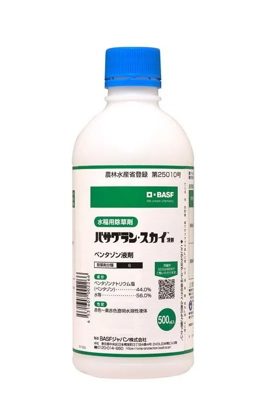 「バサグラン・スカイ™液剤」は、ベンタゾンを有効成分とする液体タイプの除草剤です。主な対象雑草としては、ホタルイやオモダカ、ヒレタゴボウなどがあり、これらに対して強い防除効果を発揮します。また、この製剤は選択的な茎葉処理除草剤であり、水稲には高い安全性を維持しつつ、効果的に雑草を抑制します。