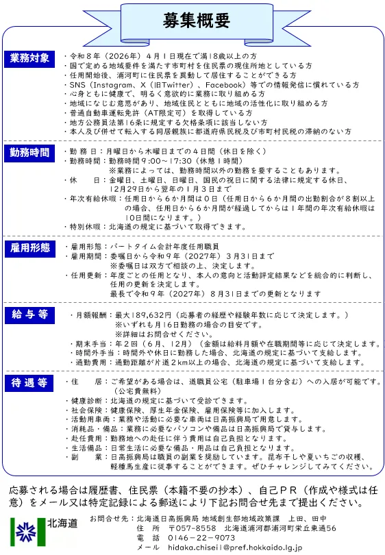 雇用は令和9年(2027年)3月31日までと定められています。この間、日高地域の振興に貢献する活動を行います。