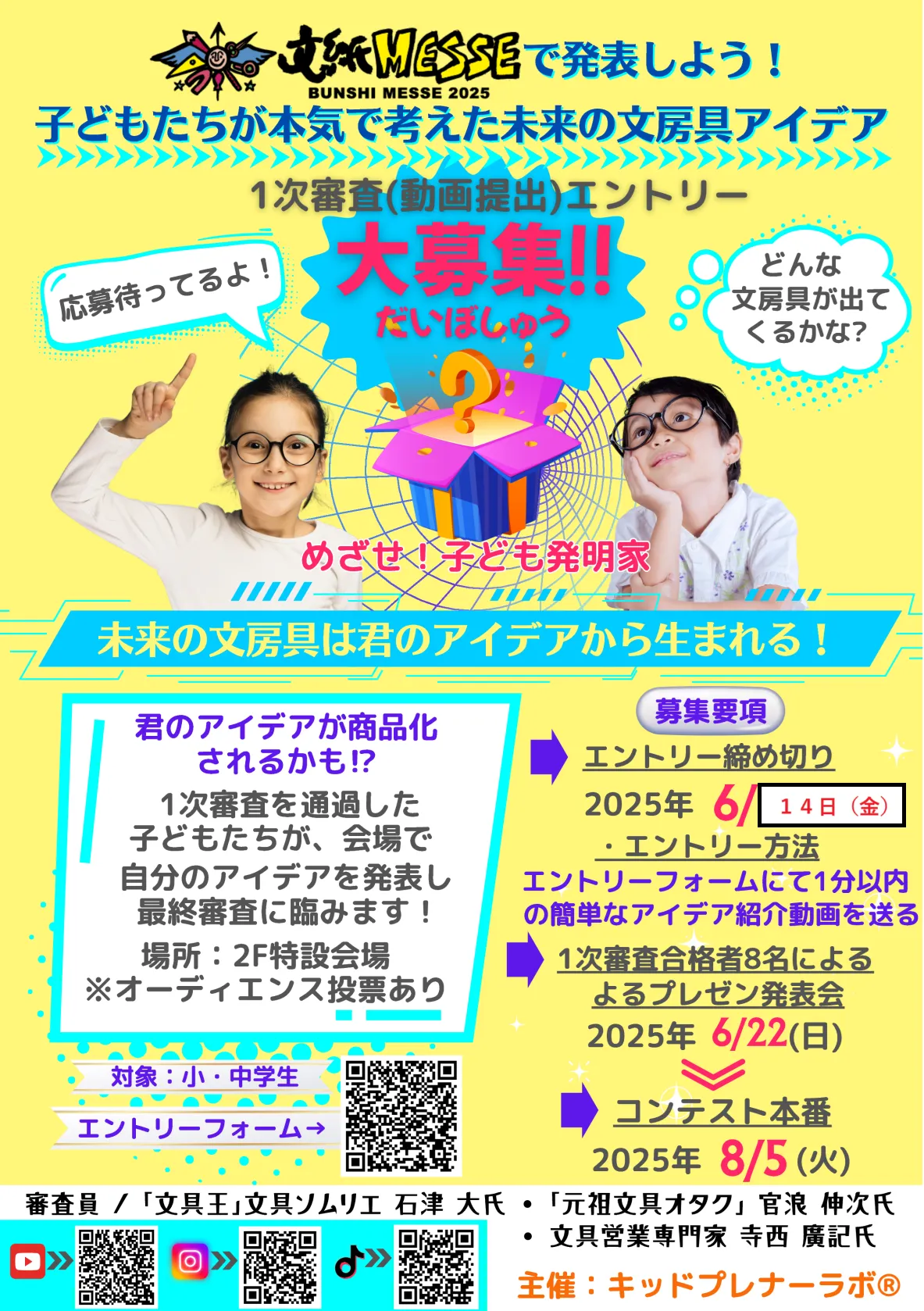 2025年8月5日(火)には、大阪市内で開催される「文紙MESSE」という文房具の祭典の一環として、選ばれたアイデアのプレゼンテーションが行われます。そこで最高のアイデアを持つ子どもには、賞金3万円とトロフィーが贈呈されます。
