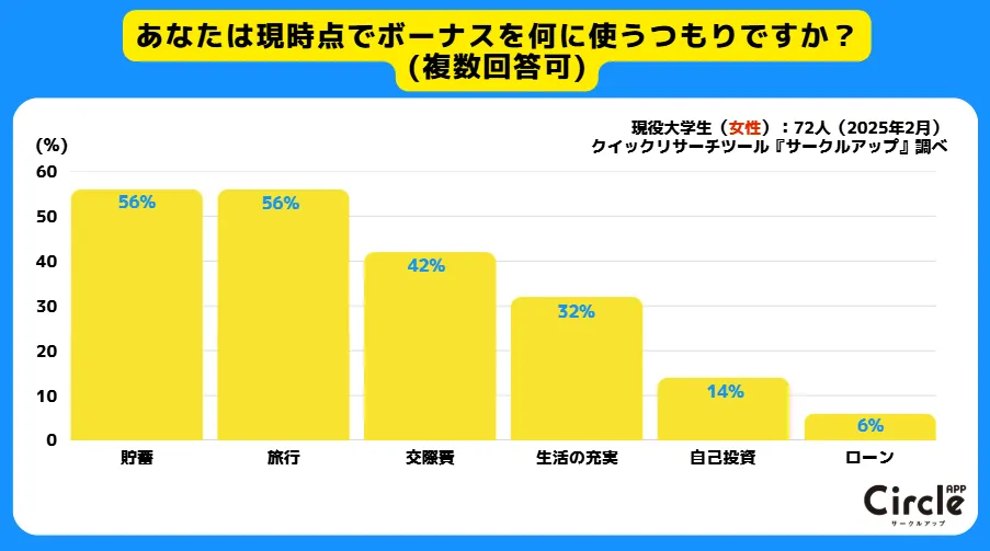 株式会社RECCOOが運営するZ世代向けのリサーチサービス『サークルアップ』が発表した調査によると、25年度卒業予定の大学生たちは、ボーナスの使い道について主に「貯蓄」と「旅行」を選んでいることが明らかになりました。