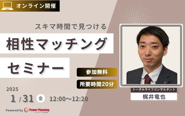 1月31日(金)12時から、無料のマネーセミナー「相性マッチングセミナー」が開催されます。このセミナーでは、スキマ時間を有効に活用して、自分にぴったりのファイナンシャルプランナー(FP)を見つけることができます。セミナーはオンラインで行われ、定員は20名。参加希望者は、開催30分前まで応募が可能ですが、枠が埋まり次第募集は終了します。早めの申し込みが推奨されます。