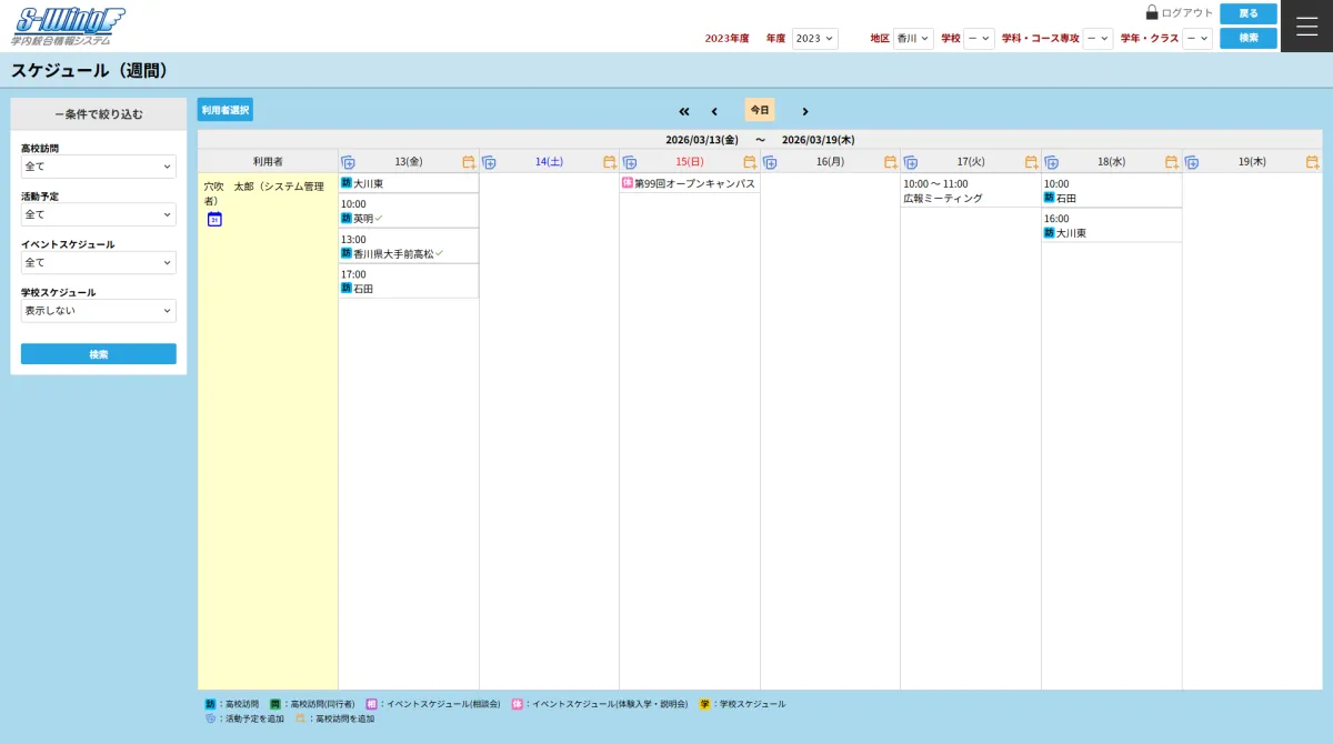 次に注目すべきは「高校訪問管理」機能です。この機能は、広報活動の計画と実施の質を向上させるものです。訪問する高校のスケジュールが一目で確認でき、必要な資料をワンクリックで出力することが可能です。訪問前の準備にかかる時間が大幅に短縮されるため、実際の対話や関係構築にもっと時間を割くことができます。