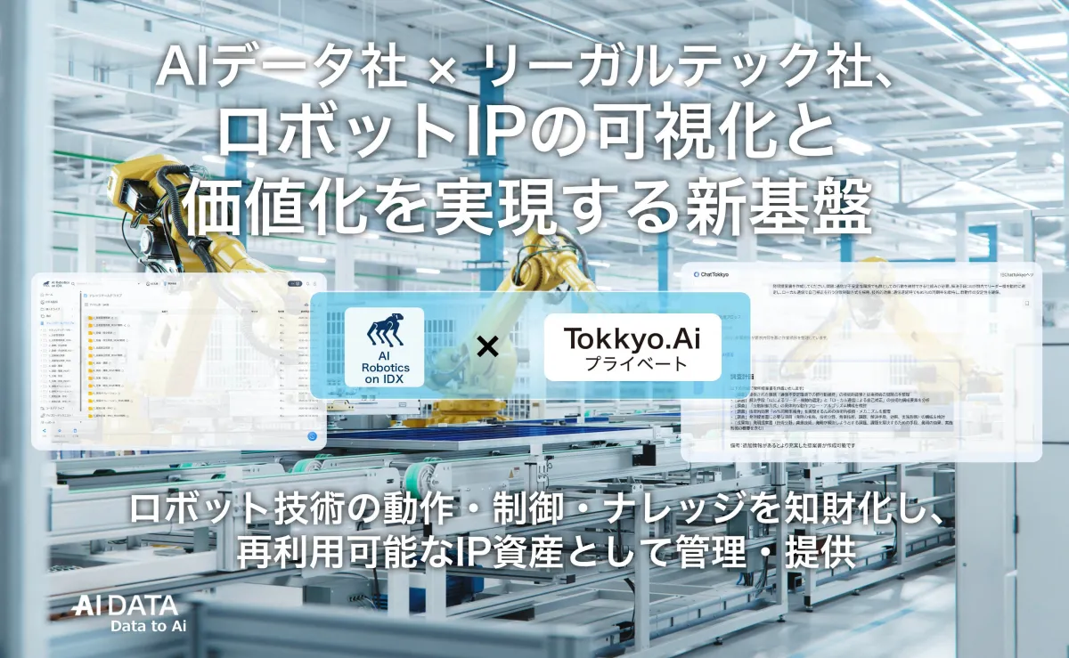 AIデータ株式会社とリーガルテック株式会社は、ロボット開発における知的財産(IP)の可視化と価値化を図る新しい統合型プラットフォーム、「AI Robotics on IDX × Tokkyo.Ai」を発表しました。この共同開発により、ロボット技術の知見を体系化し、再利用可能な知財資産として整理・管理する仕組みを提供します。