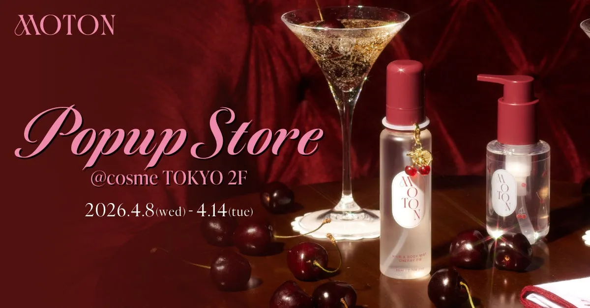 東京都渋谷区にある@cosme TOKYOにて、MOTONの新商品「CHERRY PIE」の発売を記念したポップアップイベントが、2026年4月8日から14日までの期間限定で行われます。このイベントでは、甘酸っぱいチェリーパイの香りを体験できる特別な空間が用意されます。イベントを通じてMOTONの魅力を存分に味わうことができるでしょう。