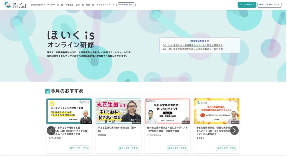 「ほいくisオンライン研修」は、保育分野における多様な知識を学べる動画プラットフォームで、500本以上のコンテンツが用意されています。動画は5〜15分程度の短時間で視聴可能なため、保育士や幼稚園教諭が忙しい日常の中でもスキマ時間を活用して学ぶことができます。2024年のサービス開始以来、多くの利用者に支持されています。