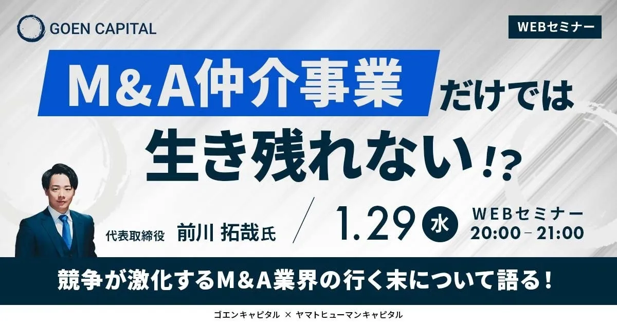 2025年1月29日(水)の夜、M&A仲介業界の未来をテーマにしたウェビナーが開催されます。このイベントは、ヤマトヒューマンキャピタル株式会社が主催し、参加者はオンラインで無料で参加できるビッグイベントです。