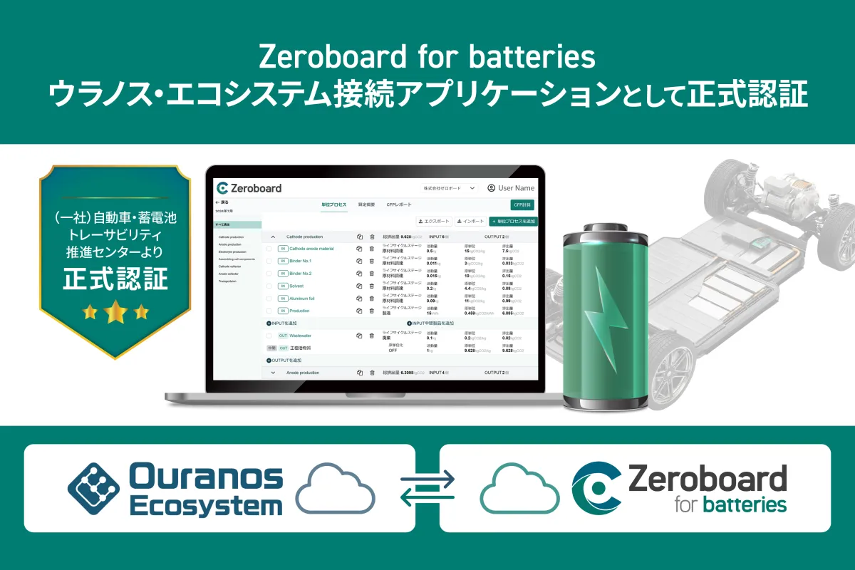 東京都港区に本社を構える株式会社ゼロボードが、自動車完成車や蓄電池メーカーに導入するアプリケーション『Zeroboard for batteries(ゼロボード フォー バッテリーズ)』の正式認証を受けたことを発表しました。このアプリケーションは、経済産業省が推進するデータ連携基盤であるOuranos Ecosystem(ウラノス・エコシステム)と相互に接続可能とされ、一般社団法人自動車・蓄電池トレーサビリティ推進センター(ABtC)による認証を取得したものです。