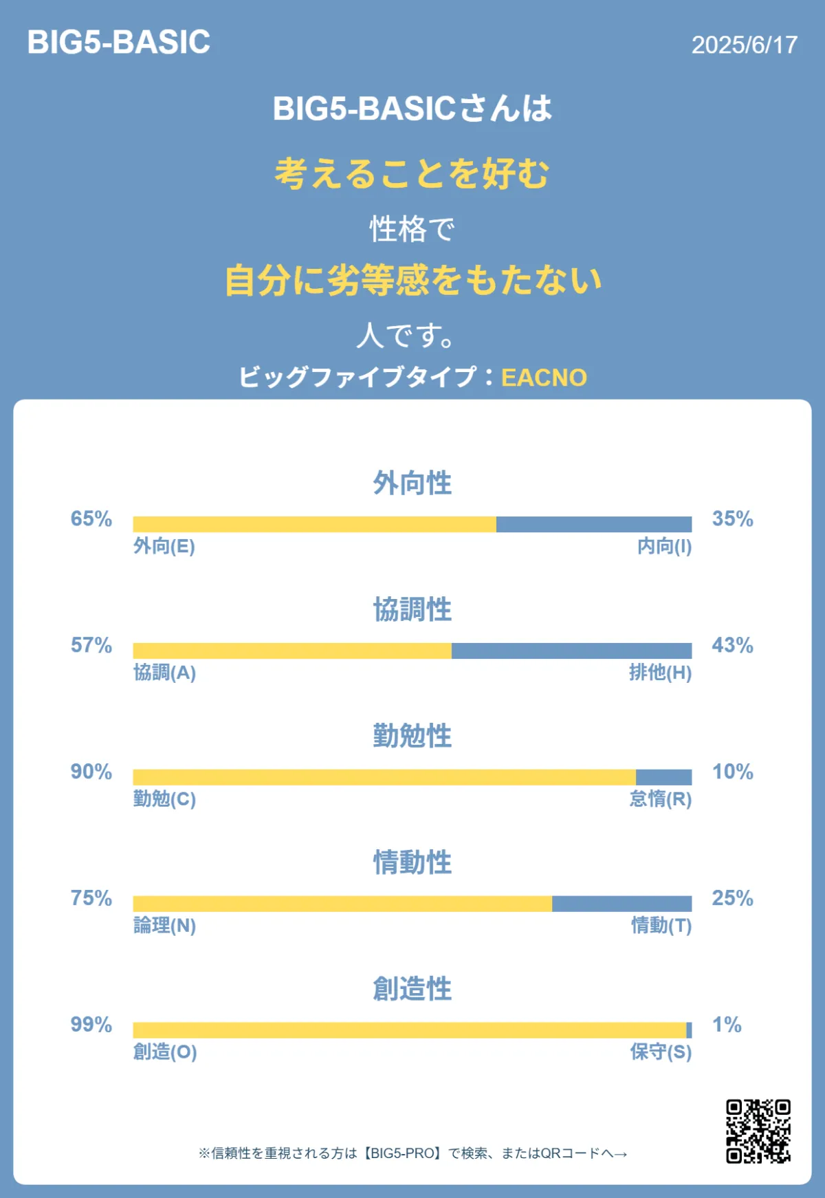 BIG5-BASICは、誰でも簡単に無料で受けられるWebベースの性格診断です。理論は心理学の基盤として知られる「ビッグファイブ理論」に基づき、たった10分ほどの質問に答えるだけで、自分の性格傾向を5つの主要因(外向性、協調性、勤勉性、情動性、創造性)から分析できます。診断結果はグラフやスコアで表示され、仕事や人間関係、さらにはキャリア設計にも活用されています。