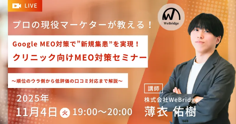 2025年11月4日、オンラインにて「Google MEO対策で新規集患を実現!」をテーマにしたクリニック向けのセミナーが開催されます。このセミナーは参加費が無料で、どなたでも気軽に参加できるイベントです。