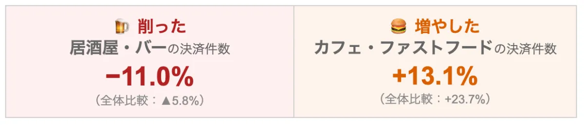 一方で、カフェやファストフードでの月間決済件数は前年比で13.1%増加しています。この増加に加え、決済単価も4.9%上昇しており、ファミリーランチやカフェデートが普及しています。特に、カップルや家族単位でのプチ外食が新たなトレンドとして定着しつつあることがうかがえます。