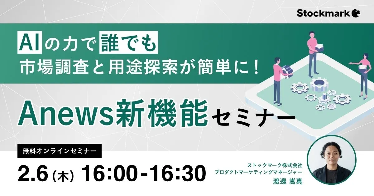 ストックマーク株式会社は、その先進的な自然言語処理AIを駆使した情報収集プラットフォーム「Anews」と「Astrategy」を提供しています。2025年2月6日、同社は「AIの力で誰でも市場調査と用途探索が簡単に!Anews新機能セミナー」をオンラインで開催します。このセミナーでは、特に新たにリリースされる調査エージェント機能について詳しく解説される予定です。