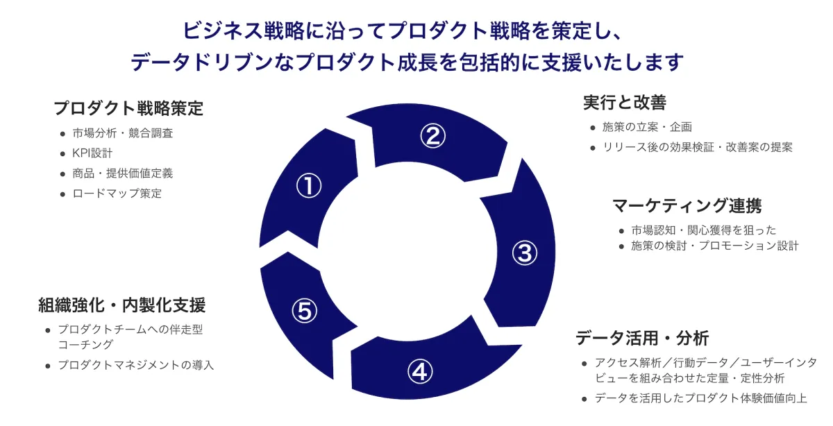本サービスでは、経験豊富なプロダクトマネージャー(PdM)が戦略策定から実行、改善までの全プロセスを支援します。具体的には、市場調査、データ分析、KPI設計、開発優先度判断などを伴走し、プロダクトの持続的な成長やビジネス価値の創出を促進します。