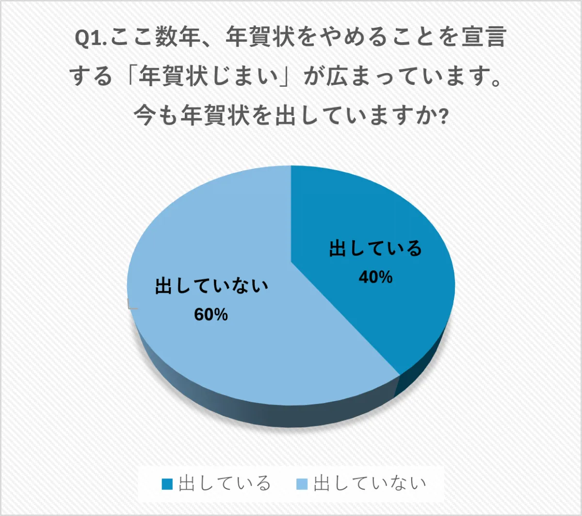 今回の調査では、年賀状を出している人は40%で、60%が出していないとのことでした。これは、年賀状文化が明らかに衰退していることを示しています。出さない理由としては、時間や手間をかけずに済むことが主な要因であるようです。この結果からは、年賀状じまいが社会全体に浸透しつつあることが読み取れます。