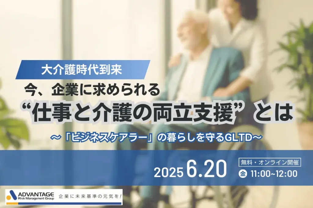 このような状況を受け、アドバンテッジリスクマネジメントでは、2025年6月20日(金)に「仕事と介護の両立支援」をテーマにしたウェビナーを開催します。セミナーでは、GLTDおよび介護特約の戦略的活用法について詳しく説明します。参加費は無料で、人事労務や福利厚生の担当者に最適な内容になっています。