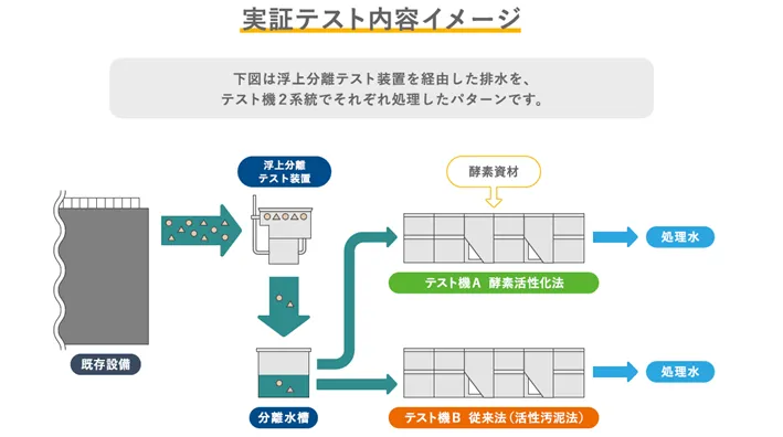 実証テストでは、従来の活性汚泥法と酵素活性化法を用いた2系統の小型テスト機を使い、排水の処理効果を測定します。特徴的なのは、既存設備からの直接排水と浮上分離装置を経由した排水の二種類を比較し、処理能力や汚泥削減率を評価する点です。