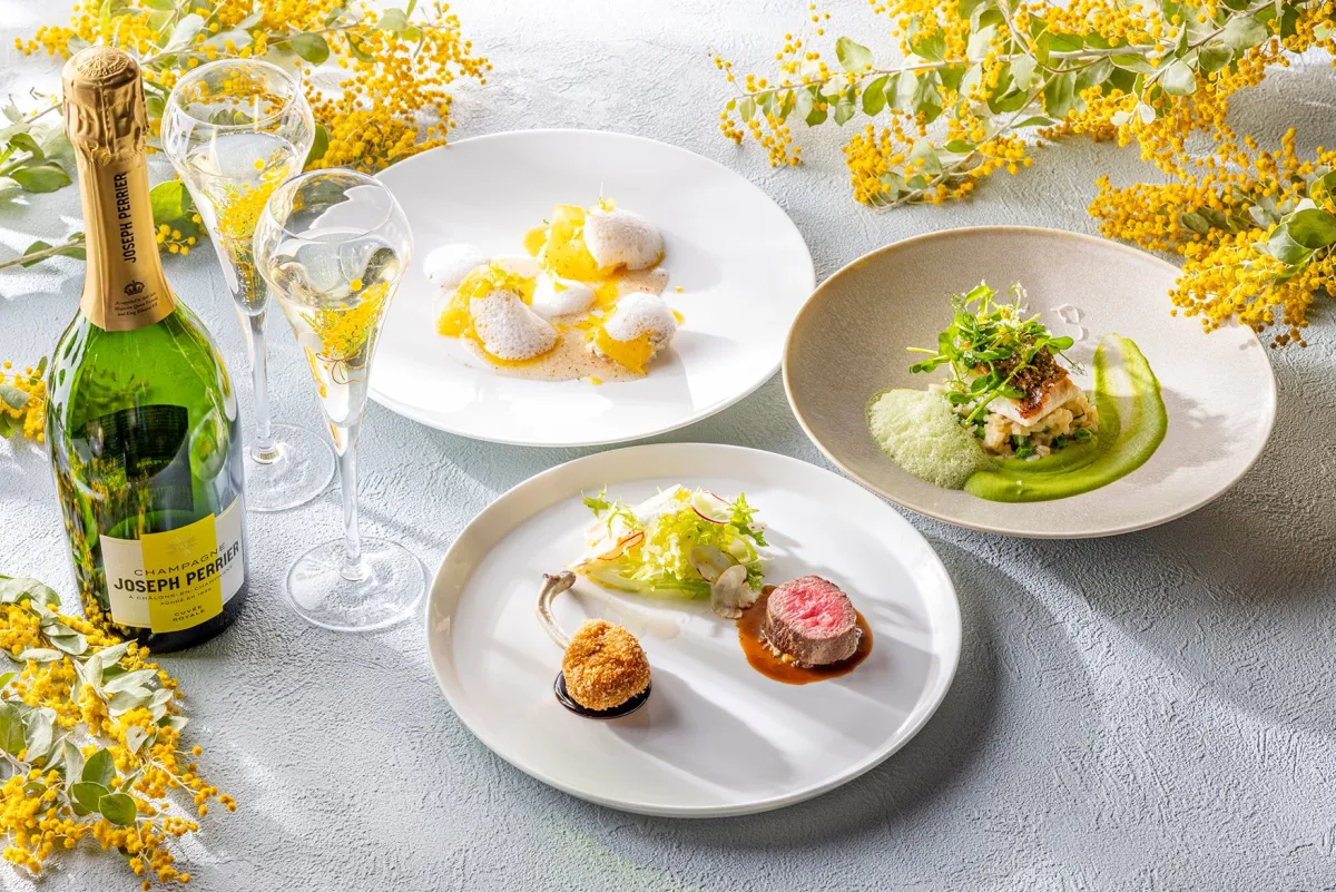 この特別コースに合わせて、ミモザが飾られたシャンパーニュ「ジョセフ・ぺリエ」も提供されます。200周年を迎えたこのシャンパーニュは、創業以来の卓越した味わいを誇り、料理との相性も抜群です。花のような口当たりとともに、ぜひコースとのマリアージュをお楽しみください。