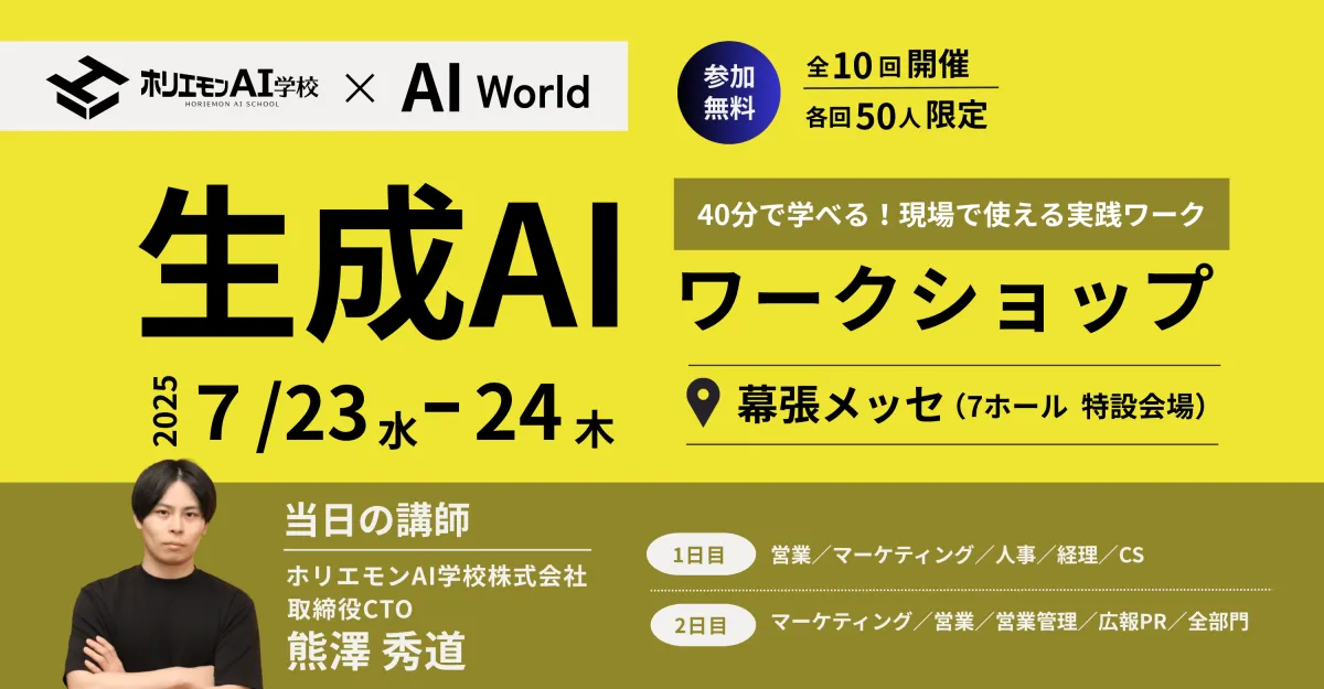 ホリエモンAI学校株式会社(東京都新宿区、CEO:荒木賢二郎)は、2025年7月に開催されるAI展示会「AI World」において、全10回の生成AIワークショップを実施することを発表しました。イベントは7月23日から25日までの3日間、幕張メッセで行われ、特に24日と25日の2日間は、各回50名の少人数制での実施となります。