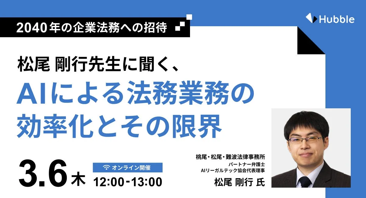 2025年3月6日(木)、株式会社Hubbleが主催するウェビナー「2040年の企業法務への招待」が開催されます。このウェビナーでは、弁護士でありAIリーガルテック協会の代表理事である松尾剛行先生をゲストに迎え、AIが法務業務に与える影響を深く探ります。