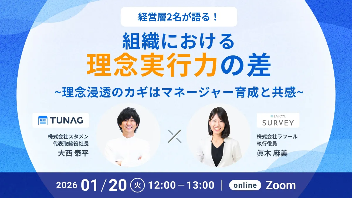 企業が掲げる経営理念やPVVが、現場では十分に機能していないとする声は多いです。理念があるにも関わらず、それを実行する組織としての差が出てしまうのは、どのような要因によるのでしょうか。この課題に対し、株式会社ラフールは1月20日(火)に「理念の実行に差が出る組織の違いとは」をテーマとしたセミナーを、株式会社スタメンとの共催でオンラインで開催します。