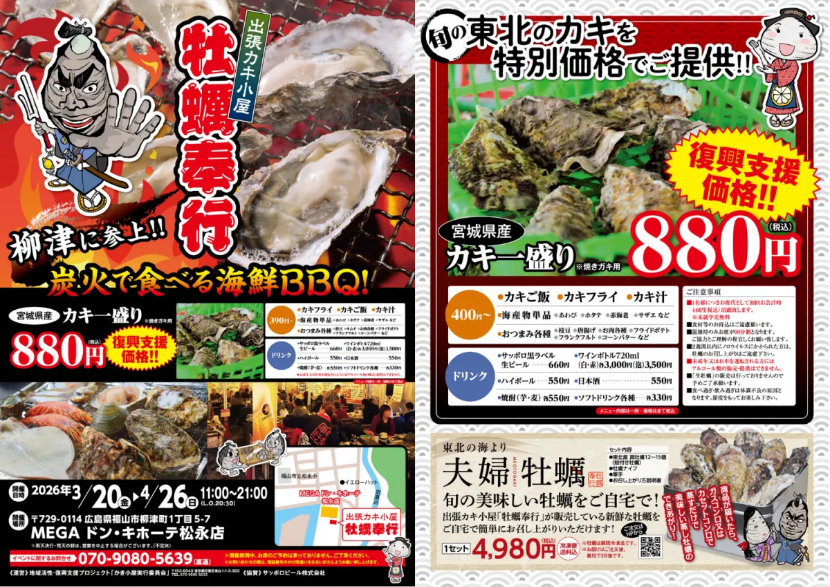 「出張カキ小屋」は、福山市のMEGAドン・キホーテ松永店の近くで行われています。興味がある方は、ぜひ参加して新鮮な海の幸を楽しんでみてください。営業日は平日の11:00から21:00まで。