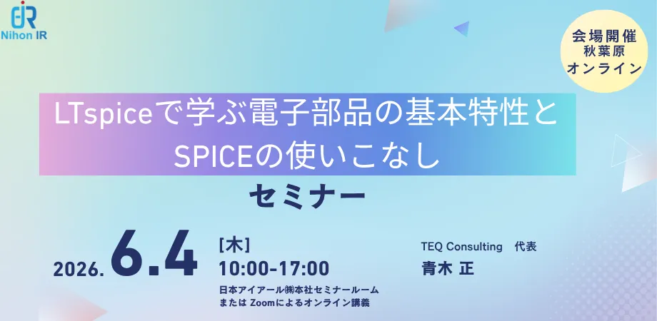 アイアール技術者教育研究所では、2026年6月4日(木)に「LTspiceで学ぶ電子部品の基本特性とSPICEの使いこなし」セミナーを開催します。こちらのセミナーは、アナログ・デバイセズ社が提供する無償のSPICEシミュレータであるLTspiceを活用し、電子部品の特性について基本から実務に使える知識までを身につけることができる貴重な機会です。