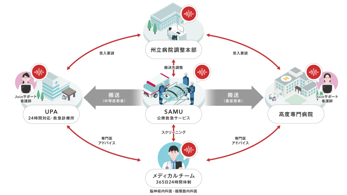 セルジッペ州では、4つの公衆救急サービス(SAMU)、10の高度専門病院、13の24時間対応の診療所(UPA)といった医療機関が、Joinを活用して連携を図っています。この体制により、患者への迅速な診断支援を行える体制が整えられており、24時間365日体制での支援が可能です。