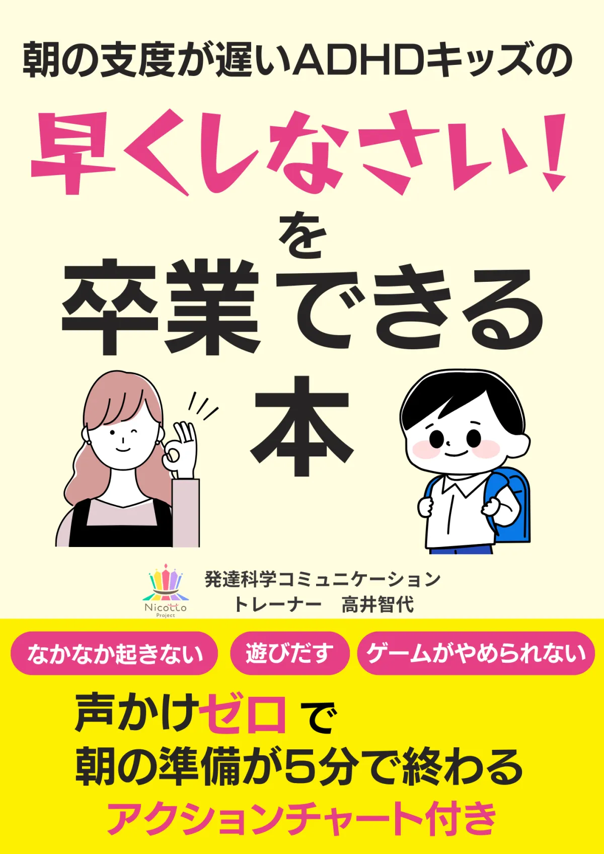 この電子書籍は、発達科学コミュニケーショントレーナーとして活動する高井智代によって執筆されました。高井氏は、衝動性の強い子どもたちに対する専門家であり、多くの家庭の悩を解決する手助けをしてきました。彼女の経験をもとに、ADHDキッズが朝の支度を声かけゼロで終わらせる方法について説明しています。