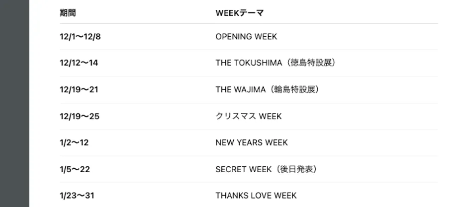 会期は2025年12月1日から2026年1月31日までの約2ヶ月間で、毎日11:00から20:00まで開催されます。また、特設展は会期中に追加で展開される予定です。