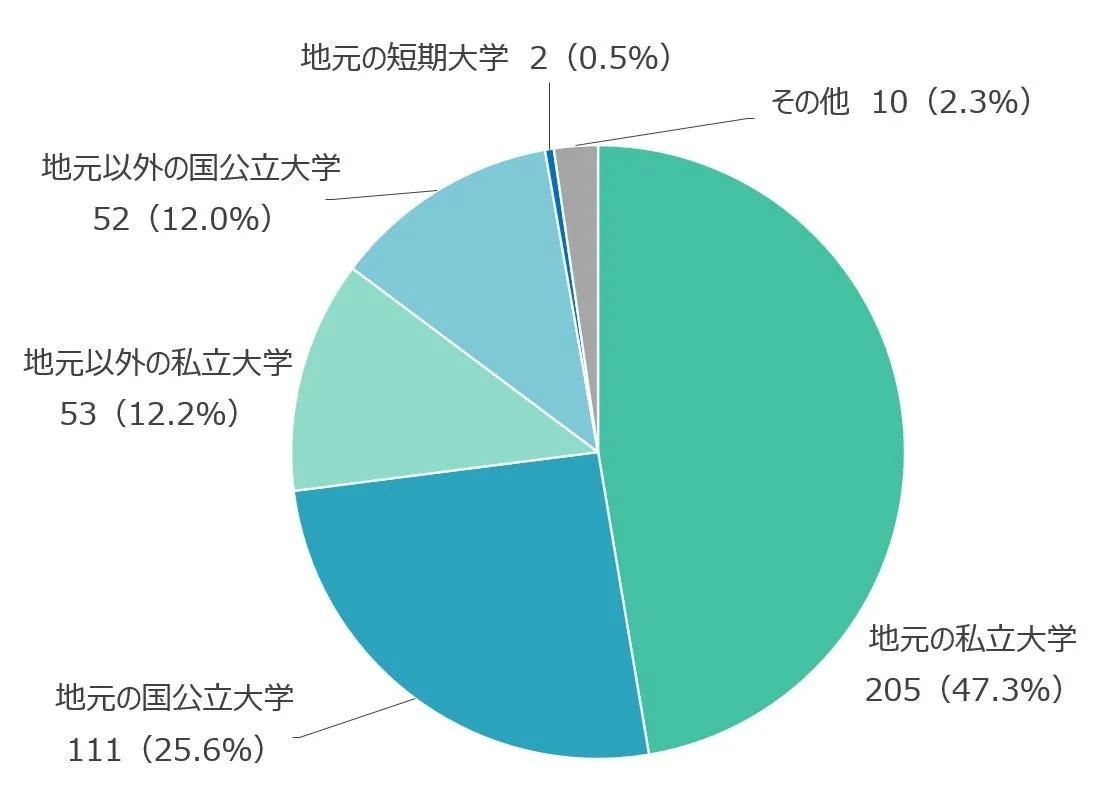 ENの調査によると、塾生の志望する大学のうち、最も多かったのは地元の私立大学で、全体の47.3%を占めました。その後は地元国公立大学25.6%、地元以外の私立大学12.2%、地元以外の国公立大学12.0%と続きました。この結果からは、生徒が地元の大学に強く惹かれていることが明らかです。実際、地元の私立・国公立大学を併せると、全体の72.9%となり、地域に密着した志望傾向が顕著です。