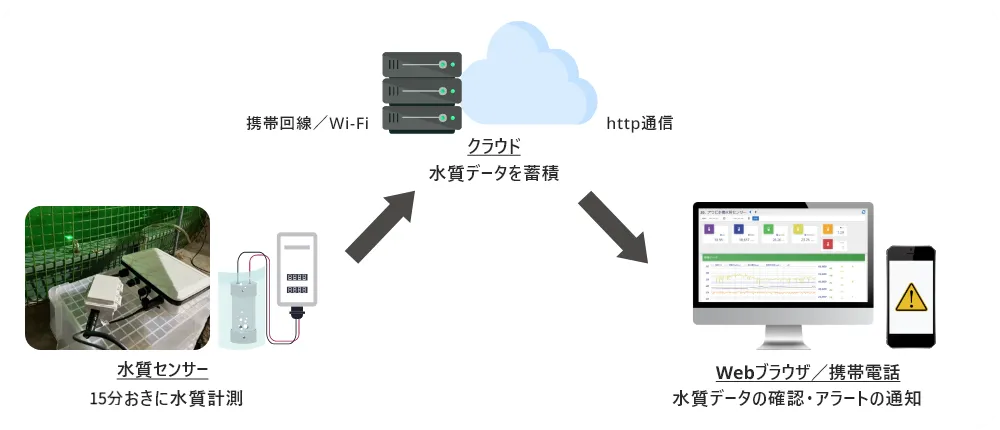 「IoT水質センサー」は、陸上・海上養殖、農業、水耕栽培、工場排水、河川環境調査など、幅広い業務で利用されています。リアルタイムで水質データを管理することで、データの蓄積・可視化・分析が行え、水質の変化予測までサポートします。