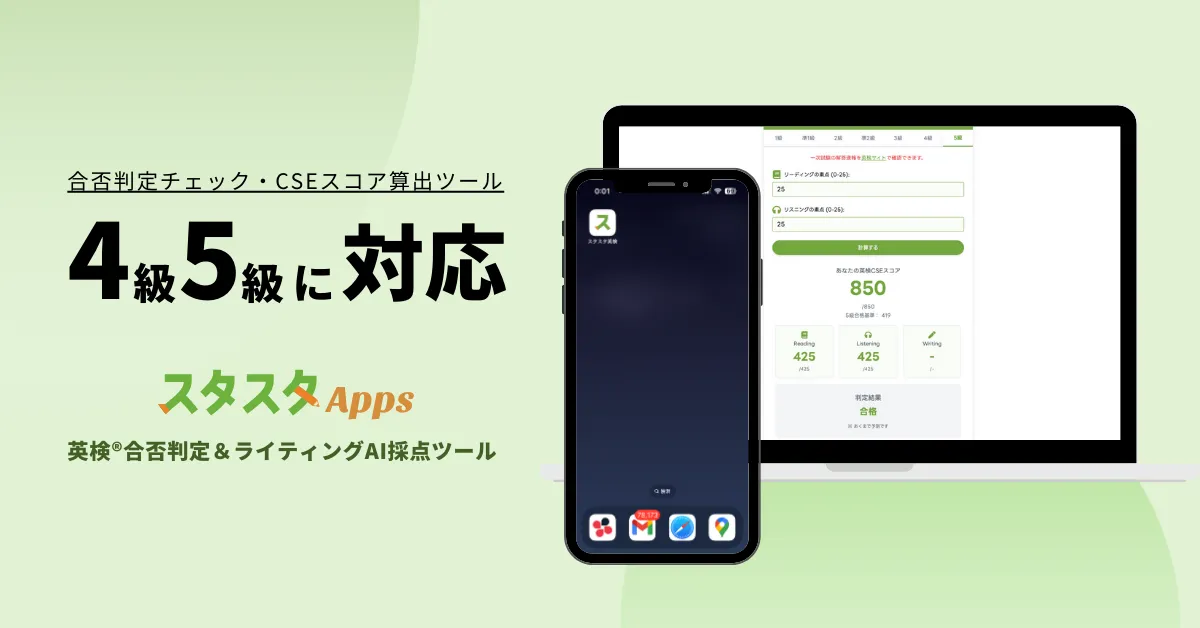 英検®4級・5級は、文字通り英語の学習を始めたばかりの学生が多く受験する試験です。特に初めて検定に挑戦する場合、自己採点が難しく、合否の見通しを立てることが困難な場合があります。そのため、スタディスタジオはこの需要に応じて新しいツールを開発しました。