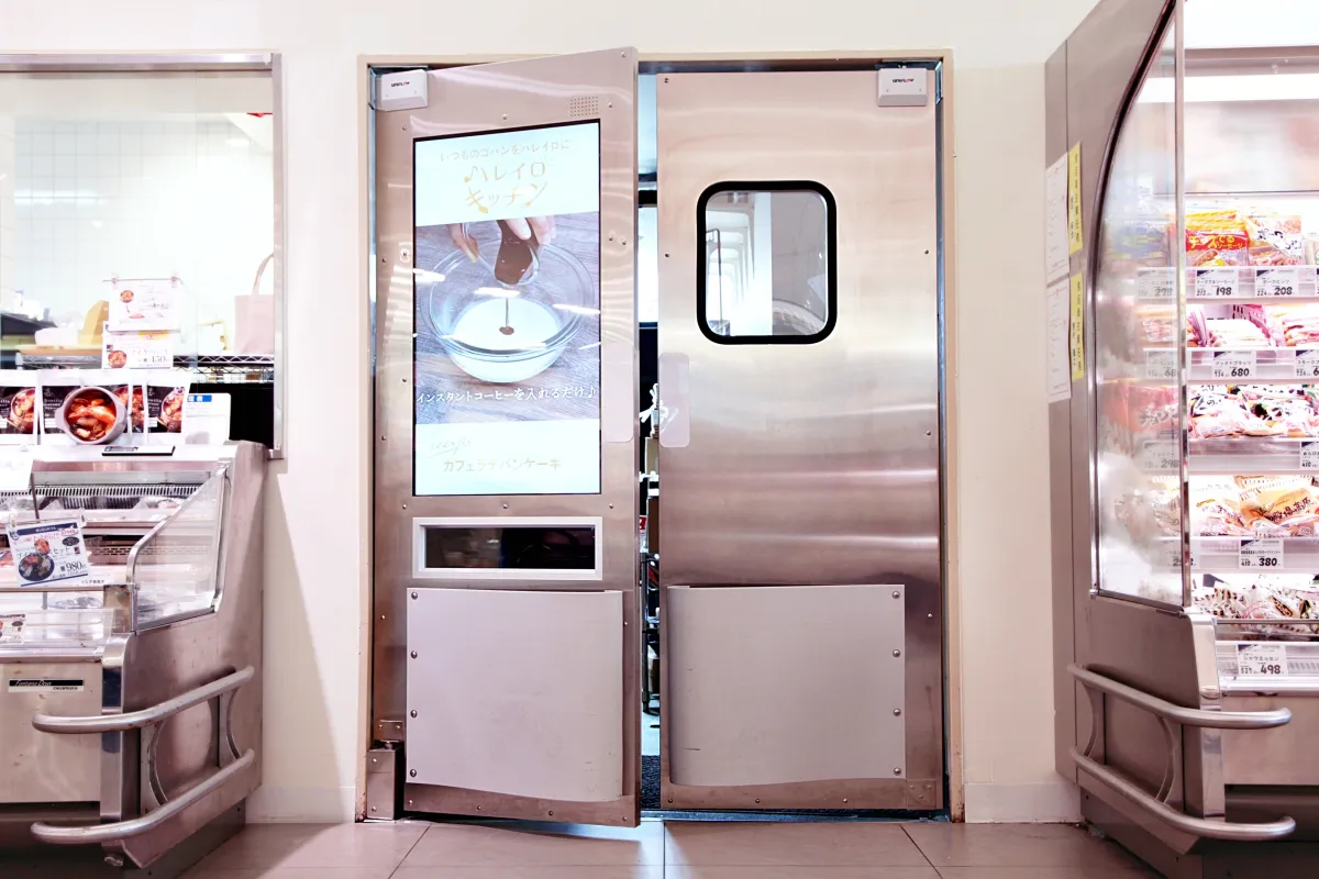 この技術の最大の利点は、商品の視認性を高めることであり、通行人の視線を集めることができる点です。特に小売り店舗では壁面にサイネージを設置するスペースが限られる中、このスイングドアは新たな販促の場として機能します。