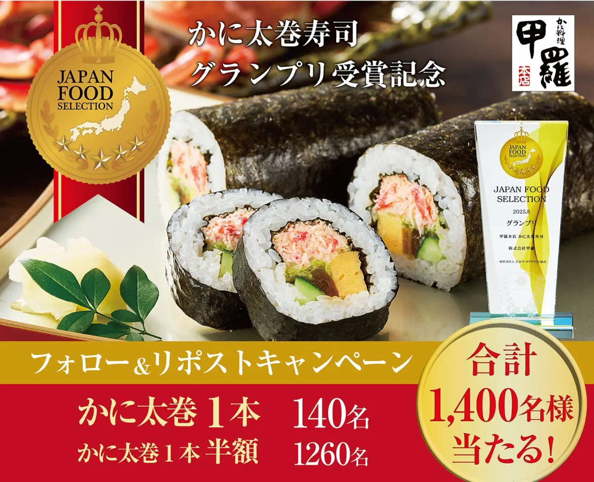 株式会社甲羅が運営するかに料理専門店「甲羅本店」が、ジャパン・フード・セレクションで名誉あるグランプリを受賞しました。その栄えある瞬間を祝い、2025年9月23日から10月6日まで、特別なキャンペーンを実施することが発表されました。このキャンペーンは、甲羅本店の人気メニューである「かに太巻寿司」を中心に展開されます。