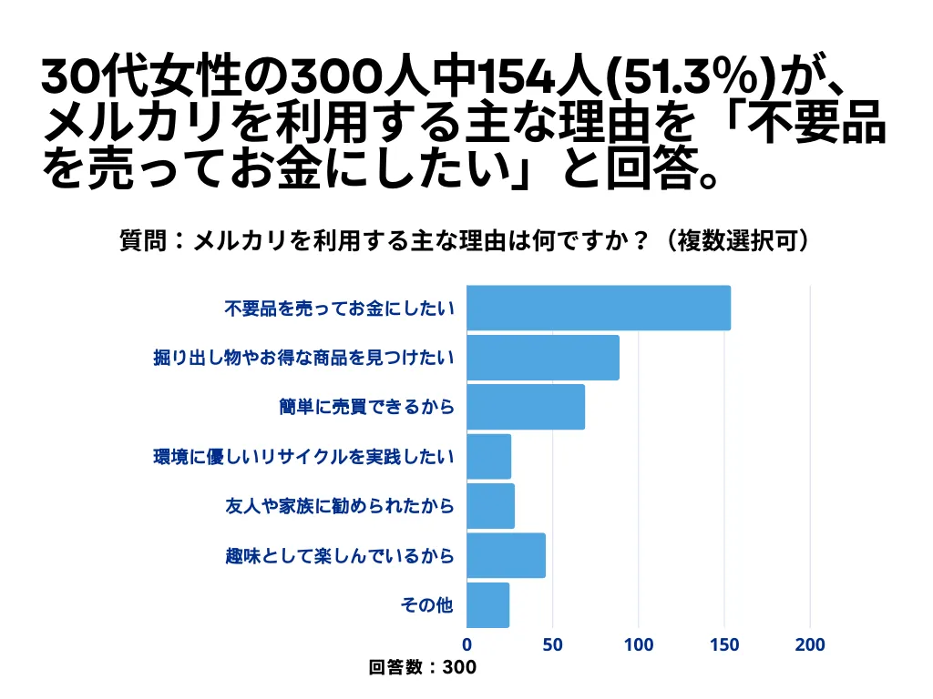 調査では、メルカリを利用する理由として最も多く挙げられたのが「不要品を売ってお金にしたい」というもので、154人がこの項目に票を入れました。このランキングからは、生活費の足しにしたり、使わなくなったアイテムを手放すことでスペースを確保したりしたいという女性のニーズが読み取れます。また、51.3%の対象者が日常生活の中で簡単に売買できるという手軽さを魅力に感じているとも考えられます。